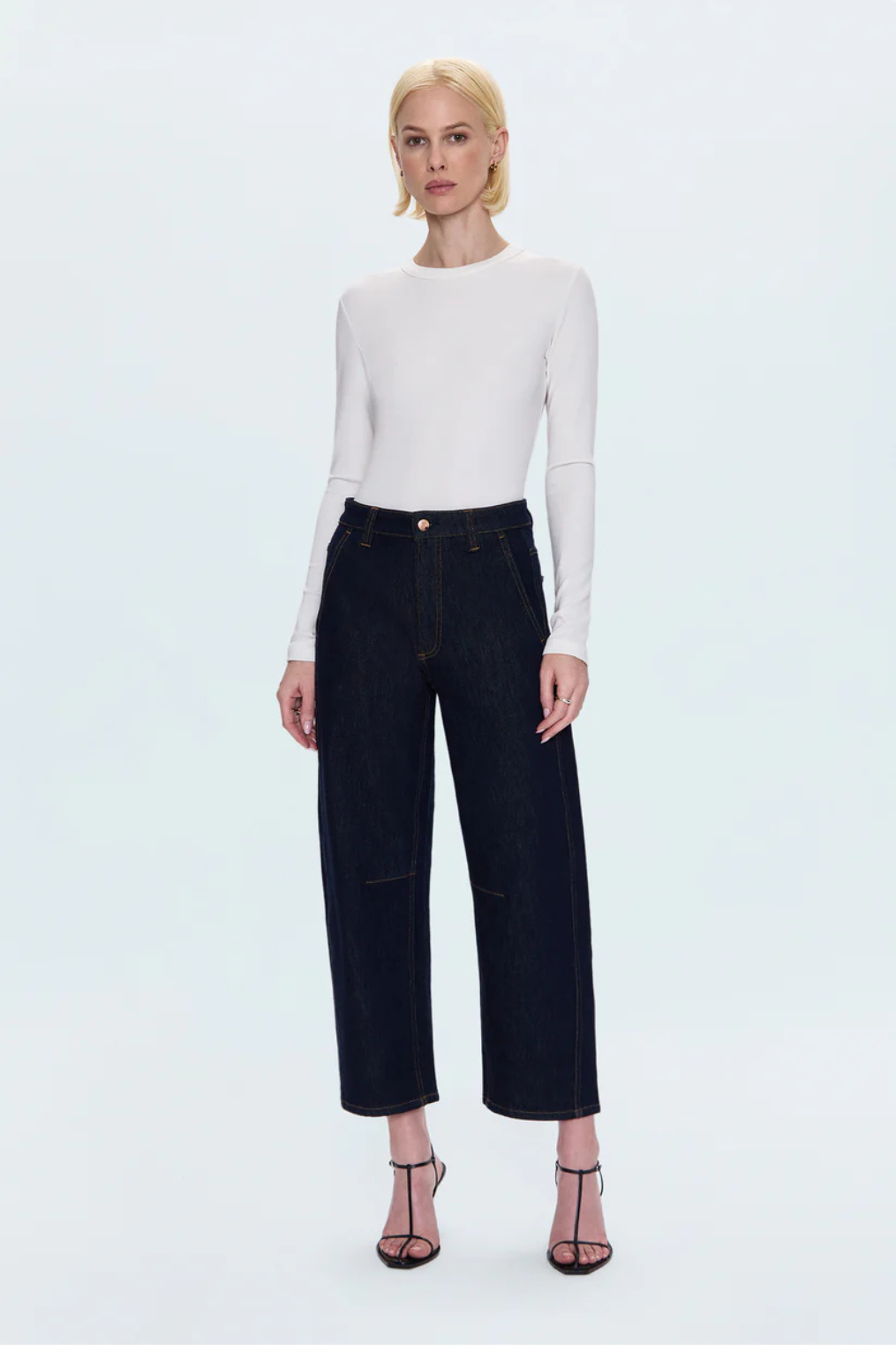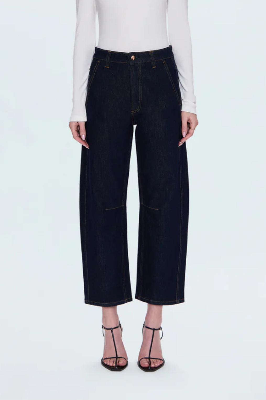 Bowed straight-leg with crescent details.