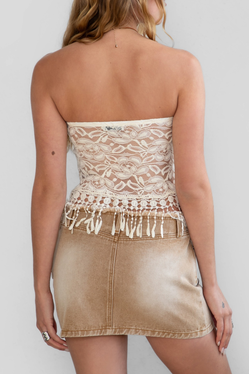 Floral lace tube top with fringe tassel hem.